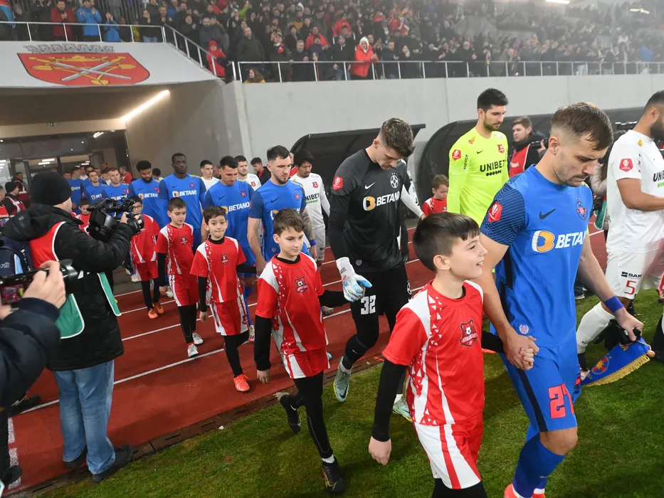 Fotbalistii stelisti Joyskim Aurelien Dawa Tchakonte, Risto Radunovic, Deian Cristian Sorescu, Stefan Tarnovanu si Darius Dumitru Olaru la startul meciului de fotbal dintre FC Hermannstadt si FCSB, contand pentru Superliga Superbet, desfasurat pe Stadionul Municipal din Sibiu, duminica 22 ianuarie 2023. © FOTO:Razvan Pasarica/SPORT PICTURES