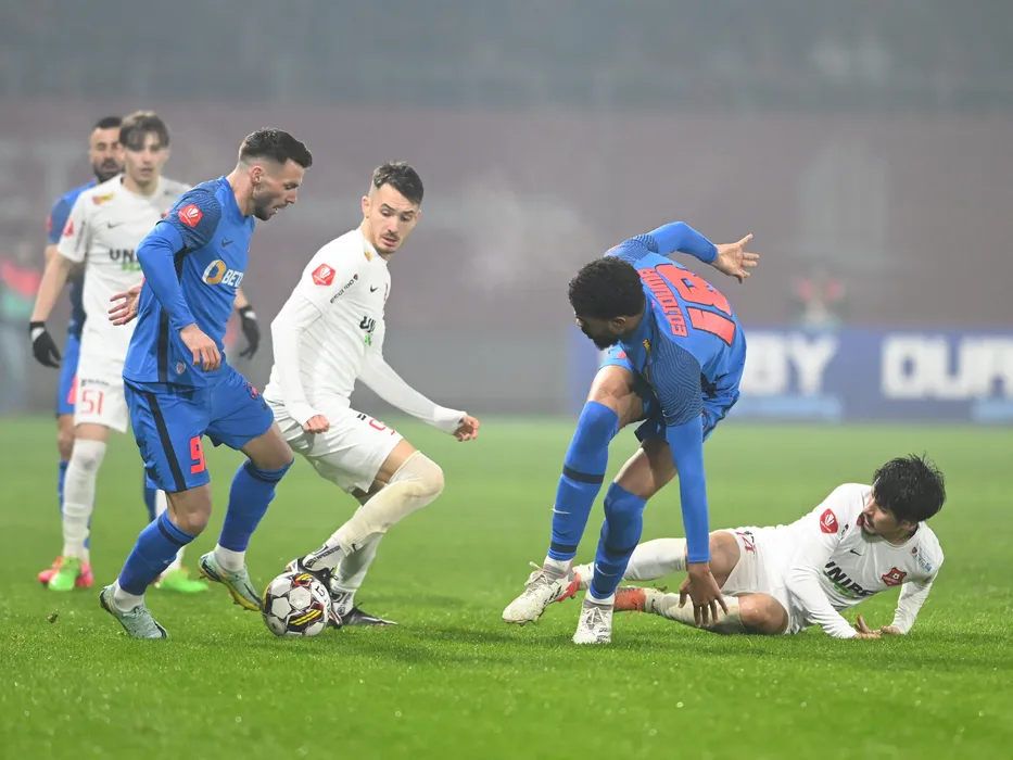 Andrei Ioan Cordea, Raul Marian Oprut, Sylas Laouari Edjouma Malcom si Mino Sota in meciul de fotbal dintre FC Hermannstadt si FCSB, contand pentru Superliga Superbet, desfasurat pe Stadionul Municipal din Sibiu, duminica 22 ianuarie 2023. © FOTO:Razvan Pasarica/SPORT PICTURES