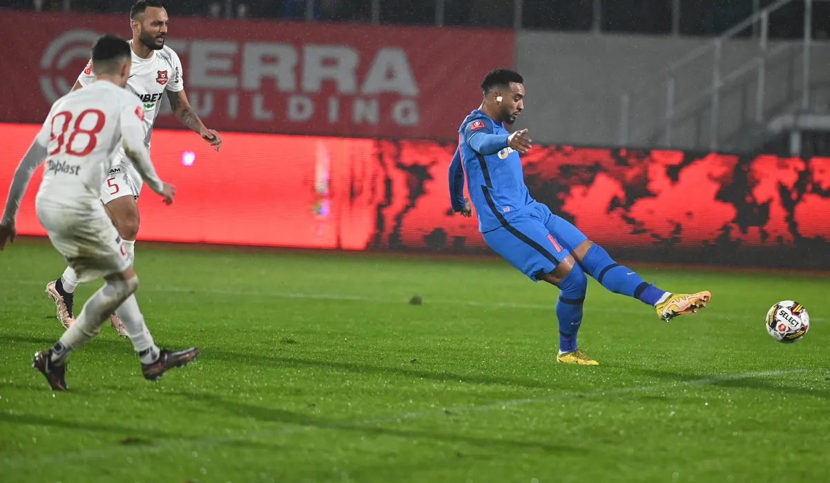 Abdel Slem Billel Omrani marcheaza un gol de langa Florin Bejan in meciul de fotbal dintre FC Hermannstadt si FCSB, contand pentru Superliga Superbet, desfasurat pe Stadionul Municipal din Sibiu, duminica 22 ianuarie 2023. © FOTO:Razvan Pasarica/SPORT PICTURES
