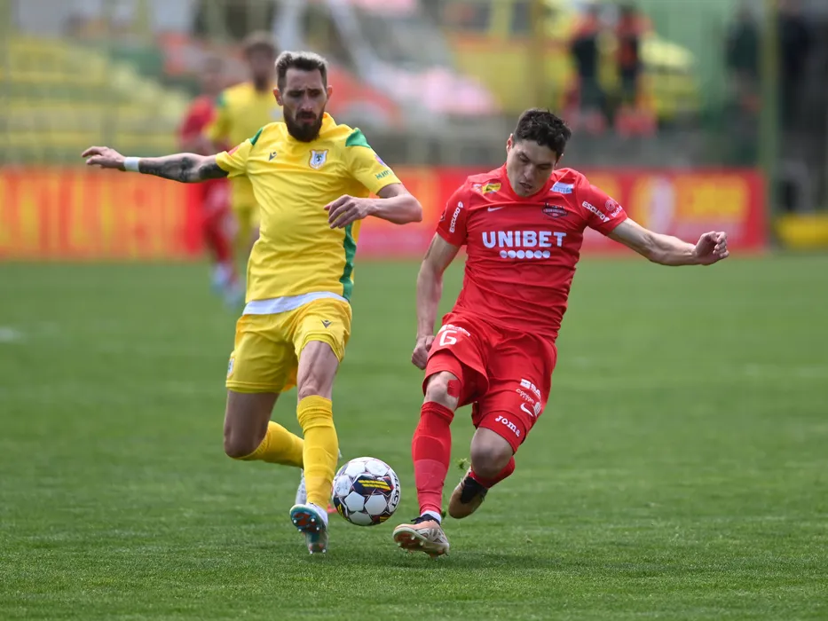 Gheorghe Bogdan Rusu si Paul Marius Antoche in meciul de fotbal dintre CS Mioveni si FC Hermannstadt, contand pentru Play-out-ul Superligii Superbet, desfasurat pe Stadionul Orasenesc din Mioveni, sambata 15 aprilie 2023. © FOTO:Razvan Pasarica/SPORT PICTURES