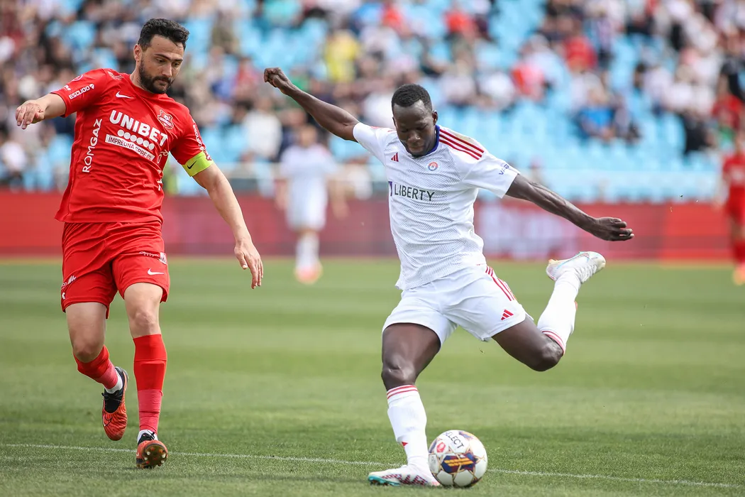 Aly Malle și Florin Bejan în meciul de fotbal dintre SC Oțelul Galați si AFC Hermannstadt Sibiu, contând pentru Superliga Superbet Play-out, desfășurat pe Stadionul Oțelul din Galați, duminică 28 aprilie 2024. © FOTO: Sorin PANĂ/SPORT PICTURES