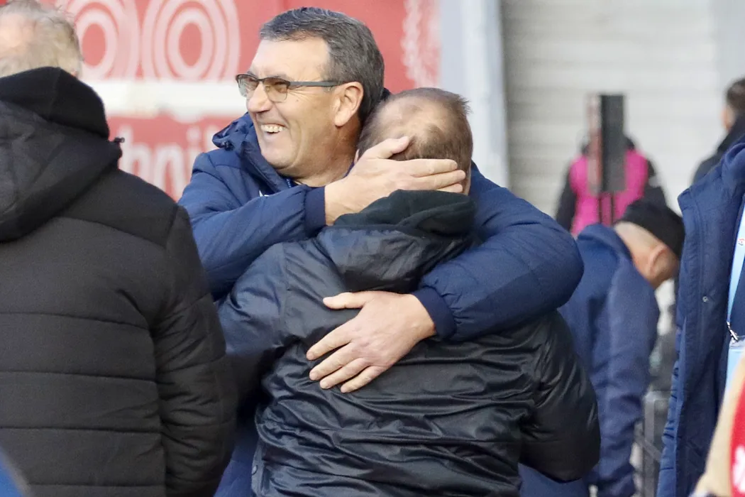 Antrenorii celor doua echipe Dorinel Ionel Munteanu si Eugen Neagoe se saluta inaintea meciului de fotbal dintre AFC Hermannstadt Sibiu si Petrolul Ploiesti, contand pentru Superliga Superbet, desfasurat pe Stadionul Municipal din Sibiu, duminica 21 decembrie 2025. © FOTO:Valentin Macrea/SPORT PICTURES