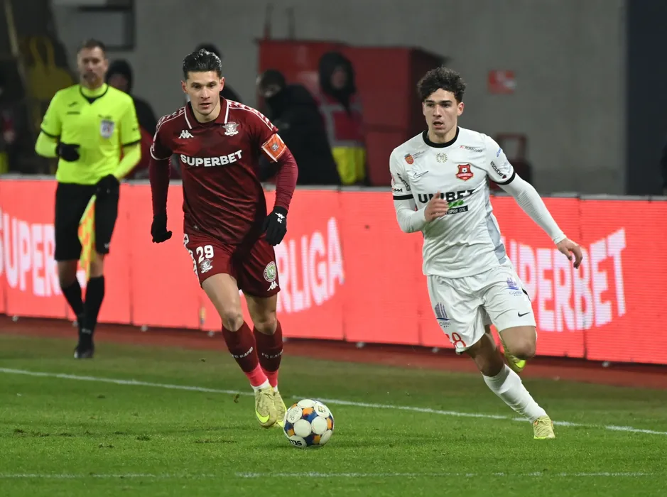 Kevin Andrei Ciubotaru si Mihai Alexandru Dobre in meciul de fotbal dintre AFC Hermannstadt Sibiu si FC Rapid Bucuresti, contand pentru Superliga Superbet, desfasurat pe Stadionul Municipal din Sibiu, marti 3 februarie 2026. © FOTO:Alex Veres/SPORT PICTURES