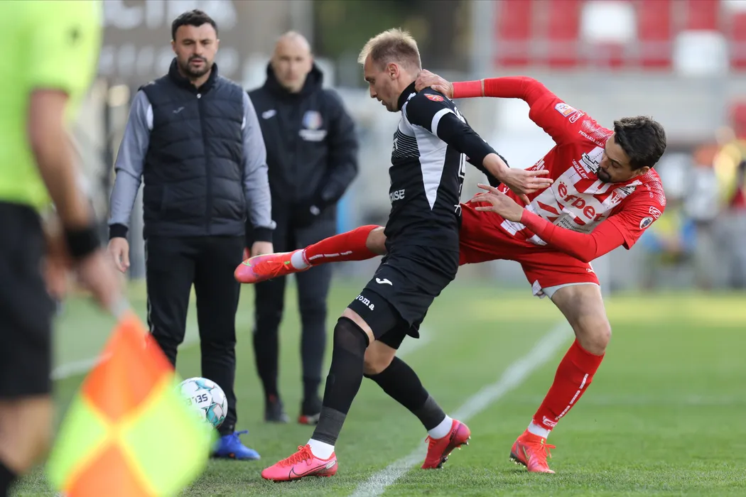 Adrian Manuel Scarlatache si Adrian Tabarcea Petre in meciul de fotbal dintre UTA Arad si FC Hermannstadt, contand pentru Liga 1 Casa Pariurilor, desfasurat fara spectatori pe Stadionul Francisc Neuman din Arad, vineri 23 aprilie 2021. © FOTO:Ciprian Petcut/SPORT PICTURES