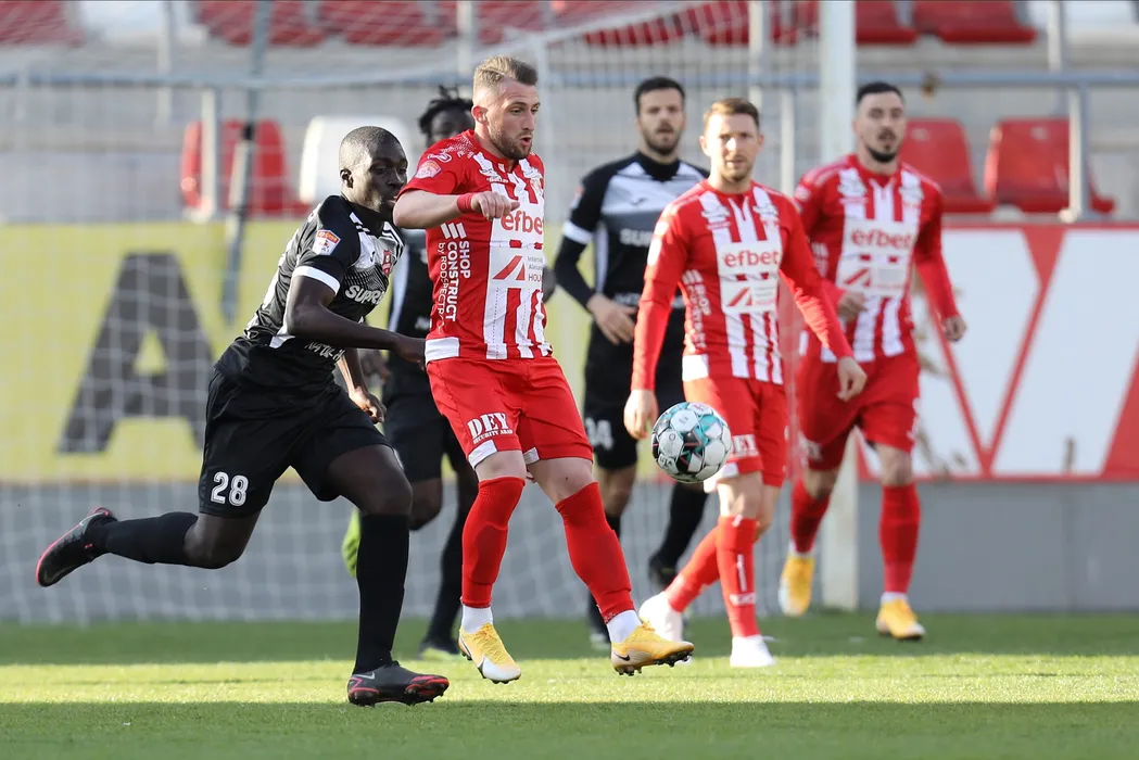 Gomes Pinto Yazalde si Sorin Cristian Bustea in meciul de fotbal dintre UTA Arad si FC Hermannstadt, contand pentru Liga 1 Casa Pariurilor, desfasurat fara spectatori pe Stadionul Francisc Neuman din Arad, vineri 23 aprilie 2021. © FOTO:Ciprian Petcut/SPORT PICTURES