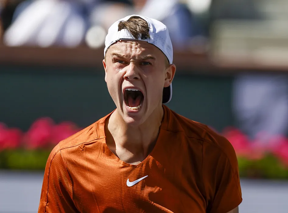 Holger Rune of Denmark reacts to winning a game against Stan Wawrinka of Switzerland during the BNP Paribas Open at Indian Wells Tennis Garden in Indian Wells, California. Mandatory Photo Credit: Charles Baus/CSM