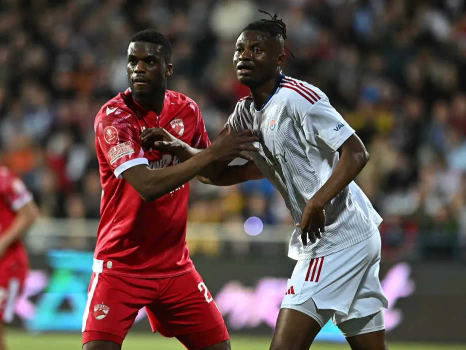 Josue Francis Homawoo si Jonathan Cisse in meciul de fotbal dintre Otelul Galati si Dinamo Bucuresti, din cadrul Play-out-ului Superligii Superbet, desfasurat pe Stadionul Otelul din Galati, luni 8 aprilie 2024. © FOTO:Razvan Pasarica/SPORT PICTURES