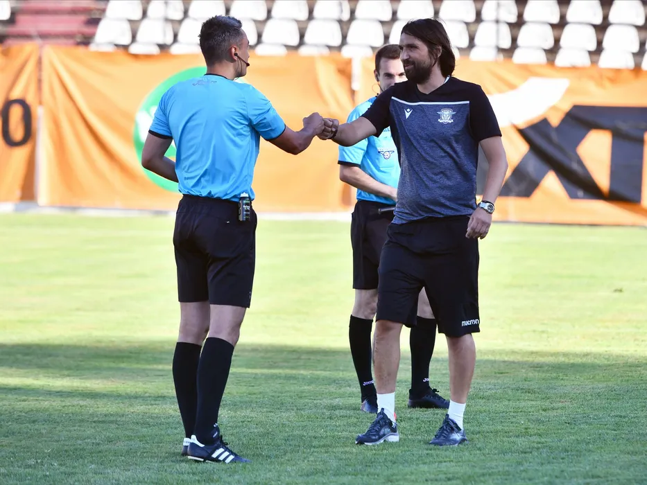 Mircea Horatiu Fesnic se saluta cu Dan Alexa in meciul de fotbal dintre Rapid Bucuresti si Turris Oltul Turnu Magurele, contand pentru play-off-ul de promovare al Ligii a-2-a Casa Pariurilor, desfasurat fara spectatori pe Stadionul Regie din Bucuresti, duminica 2 august 2020. © FOTO:Razvan Pasarica/SPORT PICTURES