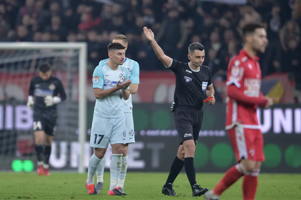 Arbitrul Horatiu Fesnic (D) ii arata un cartonas rosu jucatorului Iulian Cristea (S), de la FCSB, dupa ce acesta L-a accidentat pe dinamovistul Slavko Perovic in meciul de fotbal dintre Dinamo Bucuresti si FCSB, din etapa a XXV-a a Ligii 1, disputat pe Arena Nationala, duminica, 16 februarie 2020. ALEXANDRU DOBRE/ MEDIAFAX FOTO