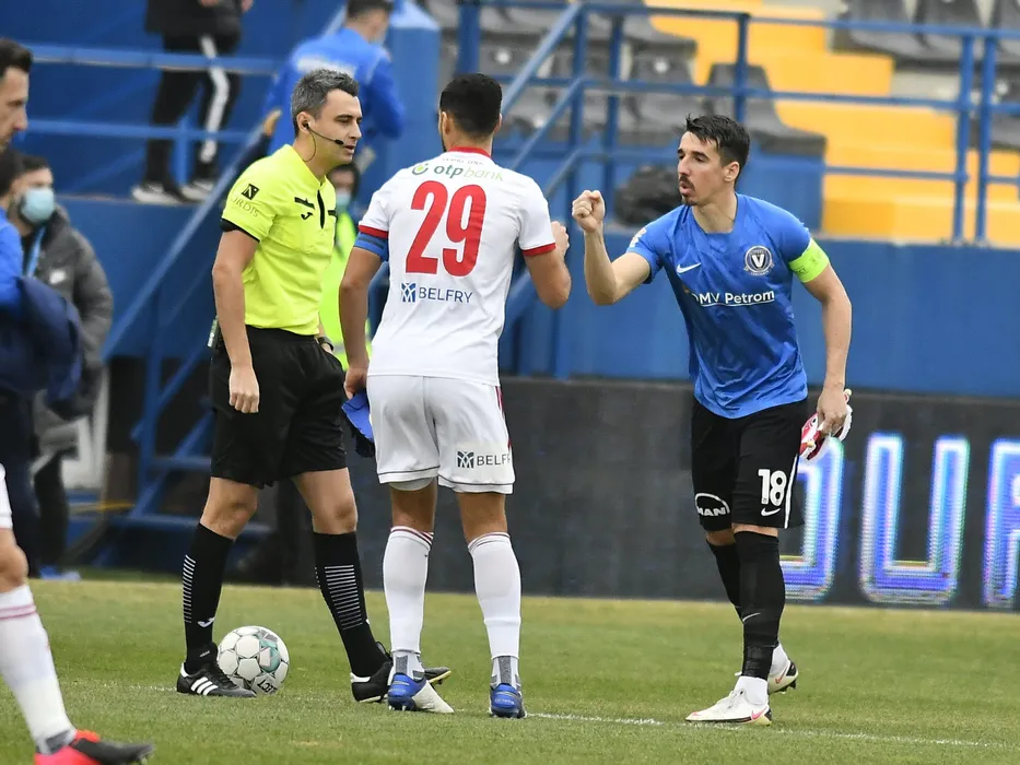 Arbitrul central Horatiu Mircea Fesnic alaturi de capitanii Rachid Ahmed Bouhenna si Andrei Viorel Artean in meciul de fotbal dintre FC Viitorul Constanta si Sepsi OSK Sfantu Gheorghe, din cadrul Ligii 1 Casa Pariurilor, desfasurat fara spectatori pe Stadionul Central al Academiei Gheorghe Hagi din Ovidiu, marti 26 ianuarie 2021. © FOTO:Razvan Pasarica/SPORT PICTURES