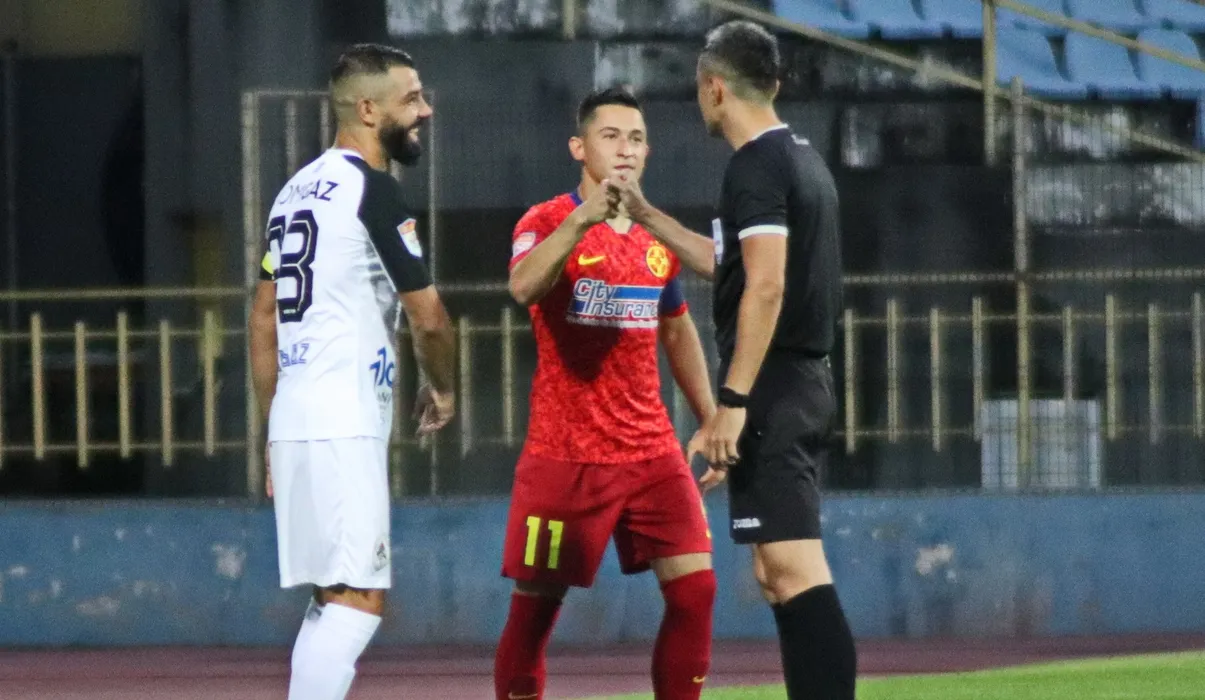 Marius Constantin, Olimpiu Morutan si arbitrul iHoratiu Fesnic n meciul de fotbal dintre Gaz Metan Medias si FCSB din etapa 9 a play-off-ului Ligii 1 Casa Pariurilor, disputat pe stadionul Gaz Metan din Medias, sambata, 25 iulie 2020.© FOTO:Macrea Valentin/Sport Pictures