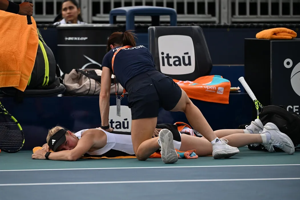 Miami Gardens, FL - Tennis stars Caroline Wozniacki and Clara Burel compete fiercely on the courts of Hard Rock Stadium during The Miami Open.
