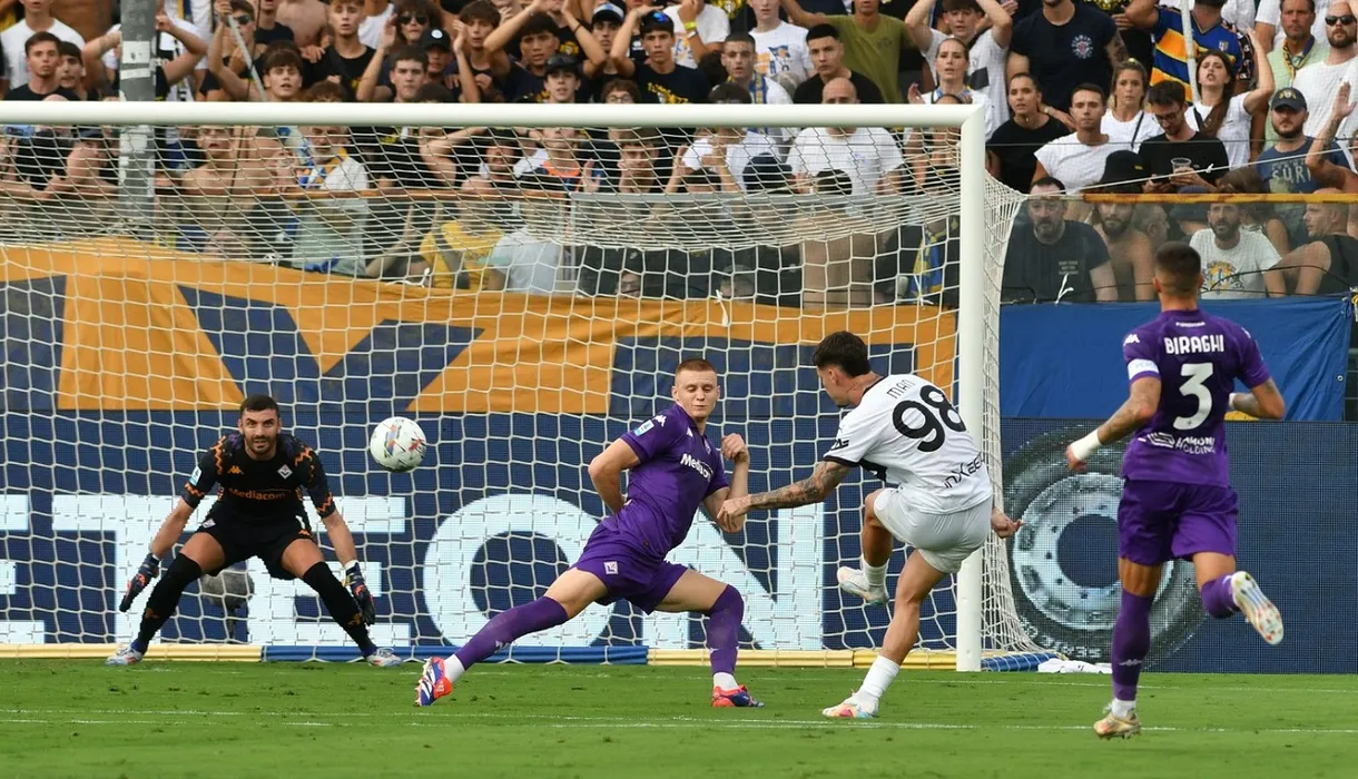 dennis man (parma) scores the 1-0 during Parma Calcio vs ACF Fiorentina, Italian soccer Serie A match in Parma, Italy, August 17 2024,Image: 899470190, License: Rights-managed, Restrictions: Per la presente foto non è stata rilasciata liberatoria. Ai sensi di legge e come già accettato in fase di registrazione sul sito, chi pubblica la foto è tenuto a pixelare tutto ciò che violi il Diritto alla Privacy di soggetti terzi (volti, targhe ecc.)., Model Release: no