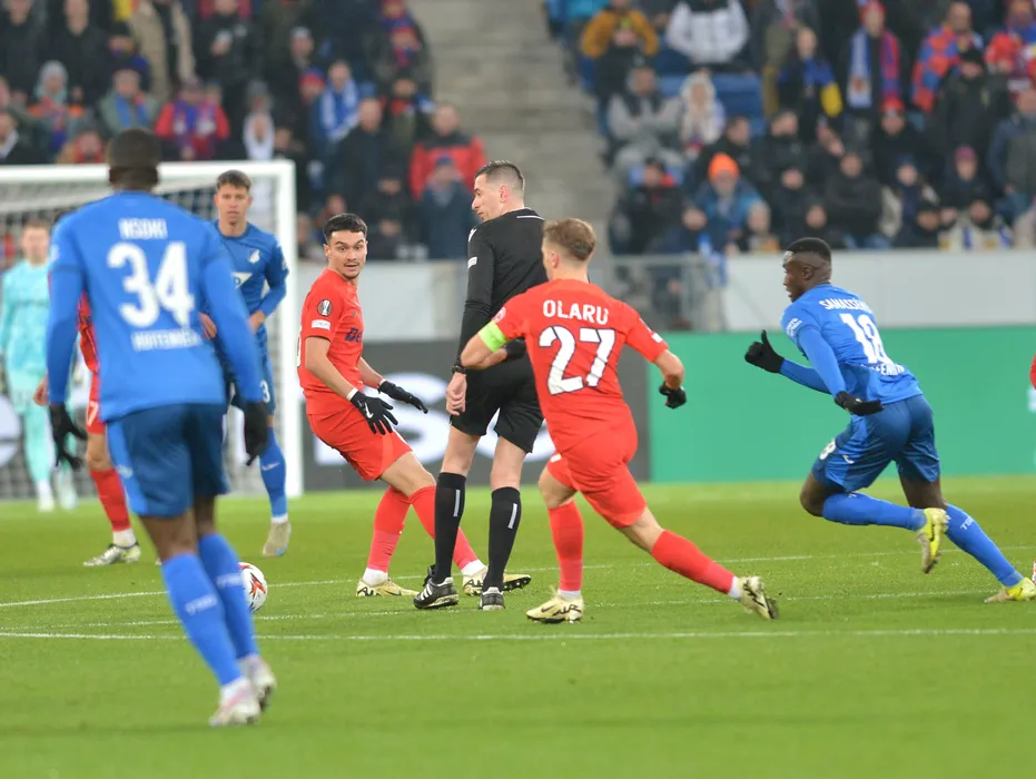 Adrian Gheorghe Șut, Darius Dumitru Olaru și Diadié Samassékou în meciul de fotbal dintre Hoffenheim și FCSB, contând pentru UEFA Europa League, desfășurat pe Stadionul Rhein-Neckar-Arena din Sinsheim, joi 12 decembrie 2024. © FOTO: Alexandra Cristina GRIGORESCU/SPORT PICTURES