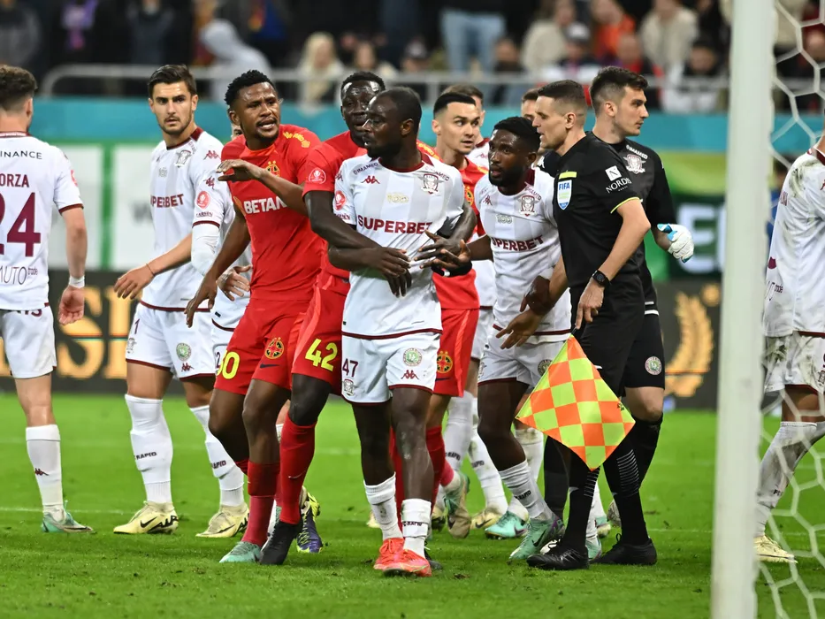 Siyabonga Ngezana, Baba Alhassan, Christopher Braun, Baba Alhassan, Funsho Ibrahim Bamgboye Marian Mihai Aioani alături de arbitrul asistent George Florin Neacsu in meciul de fotbal dintre FCSB si Rapid Bucuresti, din cadrul Play off-ului Superligii Superbet, desfasurat pe Arena Nationala din Bucuresti, sambata 20 aprilie 2024. © FOTO:Razvan Pasarica/SPORT PICTURES