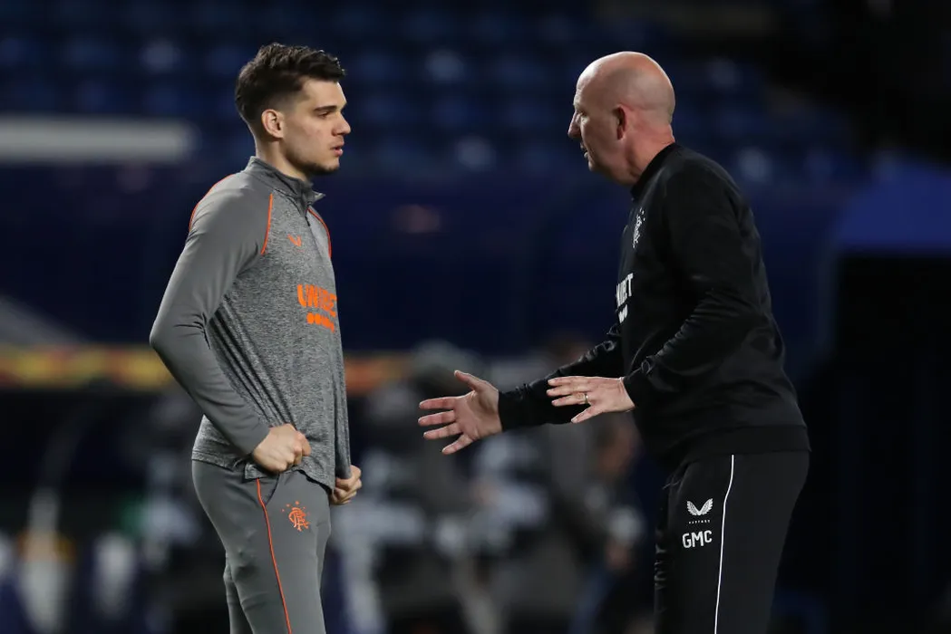 GLASGOW, SCOTLAND - MARCH 18: Ianis Hagi of Rangers interacts with Gary McAllister, First Team Coach of Rangers during the UEFA Europa League Round of 16 Second Leg match between Rangers and Slavia Praha at Ibrox Stadium on March 18, 2021 in Glasgow, Scotland. Sporting stadiums around Europe remain under strict restrictions due to the Coronavirus Pandemic as Government social distancing laws prohibit fans inside venues resulting in games being played behind closed doors. (Photo by Andrew Milligan - Pool/Getty Images)