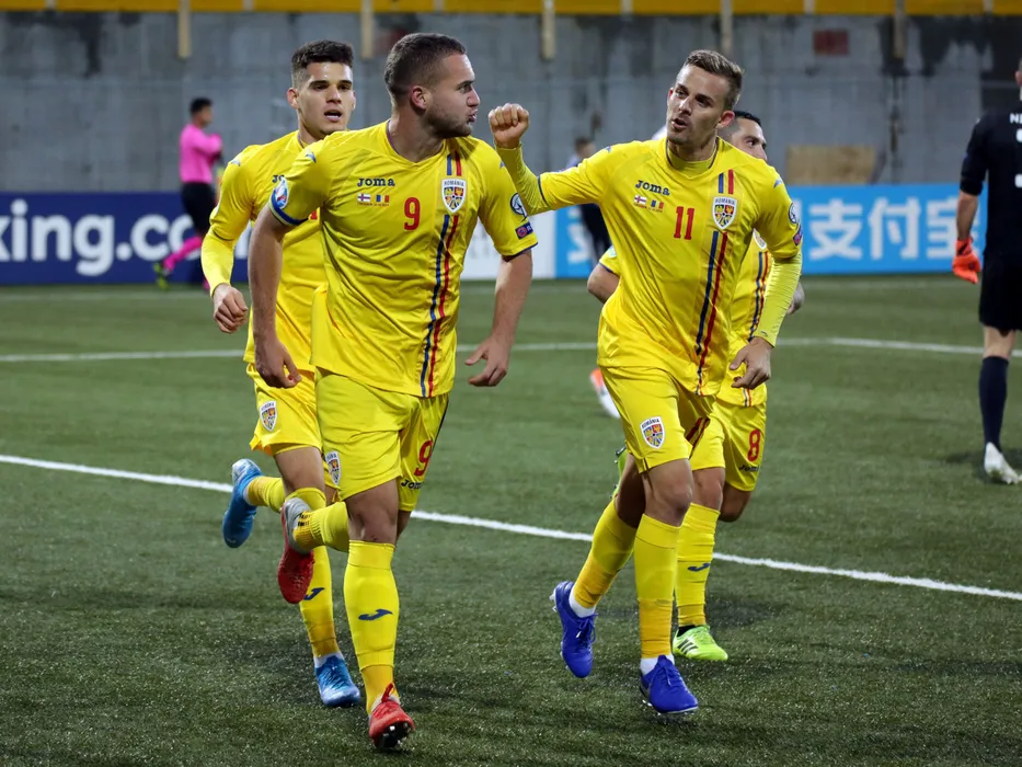 Bucurie romaneasca cu Ianis Hagi,George Puscas si Nicusor Bancu in meciul de fotbal dintre Insulele Faroe si Romania, contand pentru Preliminariile Campionatului European din 2020, desfasurat pe Stadionul Torsvollur din Torshavn, sambata 12 octombrie 2019. © FOTO:SPORT PICTURES