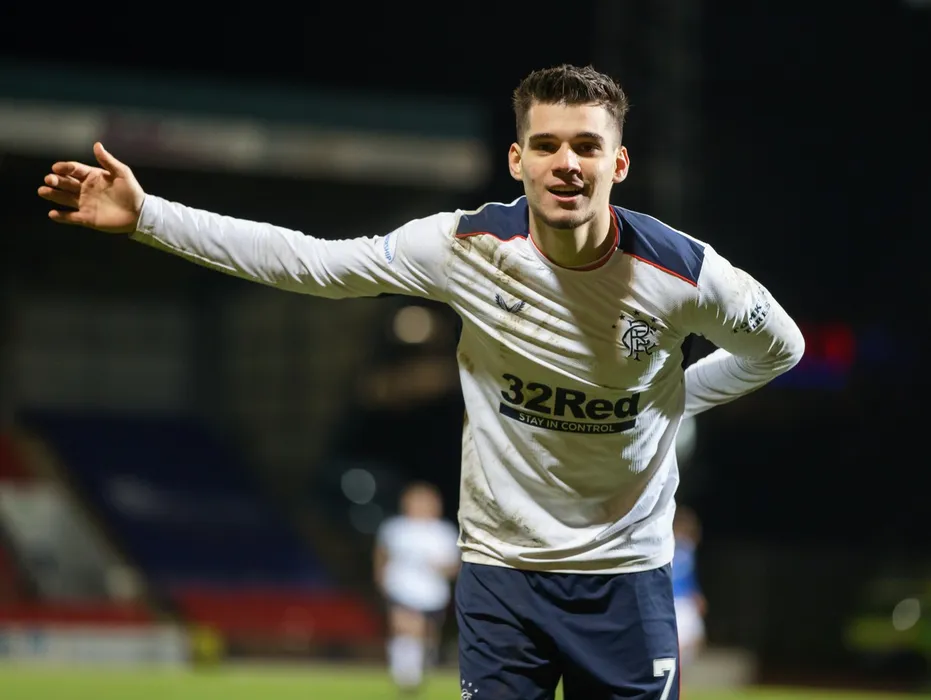 Rangers' Ianis Hagi celebrates scoring his side's third goal of the game during the Scottish Premiership match at McDiarmid Park, Perth.,Image: 578248305, License: Rights-managed, Restrictions: Use subject to restrictions. Editorial use only, no commercial use without prior consent from rights holder., Model Release: no