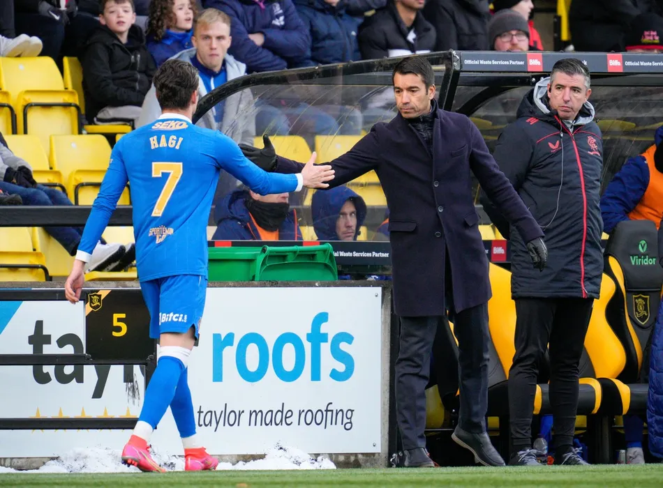 Ianis Hagi of Rangers gets a handshake from Rangers Manager Giovanni van Bronckhorst as he leaves the pitch Livingston v Rangers, Cinch Scottish Premiership, Football, Tony Macaroni Arena, Livinston, Scotland, UK - 28 Nov 2021,Image: 645313795, License: Rights-managed, Restrictions: EDITORIAL USE ONLY No use with unauthorised audio, video, data, fixture lists, club/league logos or "live" services. Online in-match use limited to 120 images, no video emulation. No use in betting, games or single club/league/player publications., Model Release: no