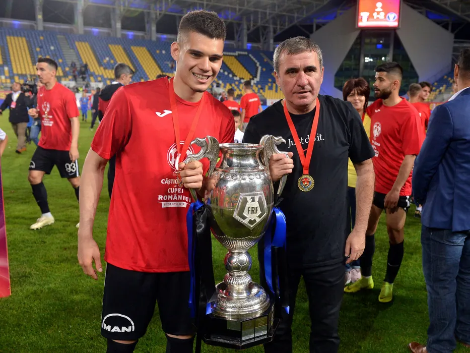 Ianis Hagi si Gica Hagi alaturi de trofeu dupa meciul de fotbal dintre FC Viitorul si Astra Giurgiu, din cadrul finalei Cupei Romaniei, desfasurat pe Stadionul Ilie Oana din Ploiesti, sambata 25 mai 2019. © FOTO:Razvan Pasarica/SPORT PICTURES