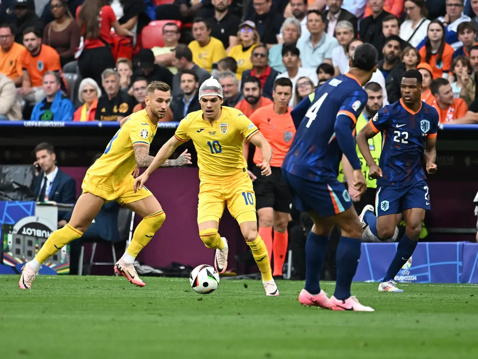Denis Drăguş, Ianis Hagi si Denzel Dumfries in meciul dintre Romania si Olanda, din cadrul UEFA EURO 2024, desfasurat pe Fussball Arena din Munchen, marti 2 iulie 2024. © FOTO:Razvan Pasarica/SPORT PICTURES