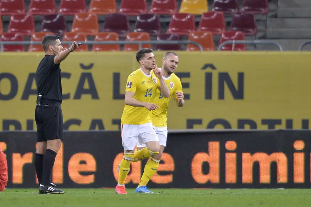 Reprezentativele Romaniei (echipament galben) si Macedoniei de Nord s-au intalnit intr-o partida contand pentru preliminariile CM 2022, joi 25 noiembrie 2021, pe Arena Nationala din Bucuresti. ALEXANDRU DOBRE / MEDIAFAX FOTO