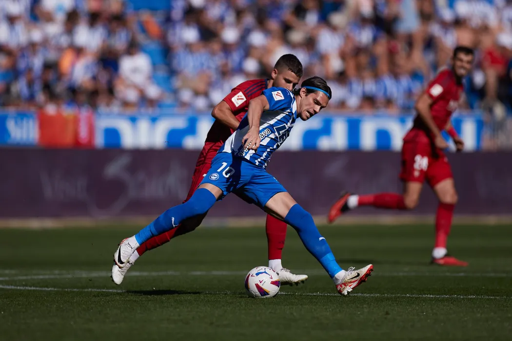 October 1, 2023: Ianis Hagi of Deportivo Alaves competes for the ball with Iker Munoz of CA Osasuna during the LaLiga EA Sports match between Deportivo Alaves and CA Osasuna at Mendizorroza on October 1, 2023, in Vitoria, Spain.,Image: 810011389, License: Rights-managed, Restrictions: , Model Release: no
