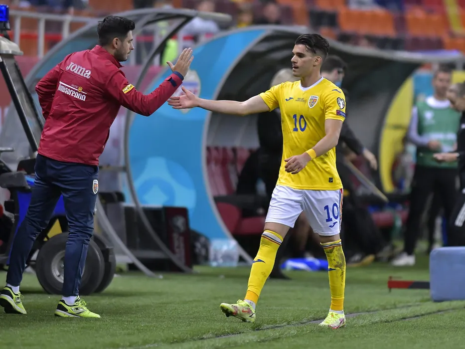Ianis Hagi felicitat in meciul de fotbal dintre Romania si Liechtenstein, contand pentru Preliminariile CM 2022, desfasurat pe Arena Nationala din Bucuresti, duminica 5 septembrie 2021. © FOTO:Razvan Pasarica/SPORT PICTURES