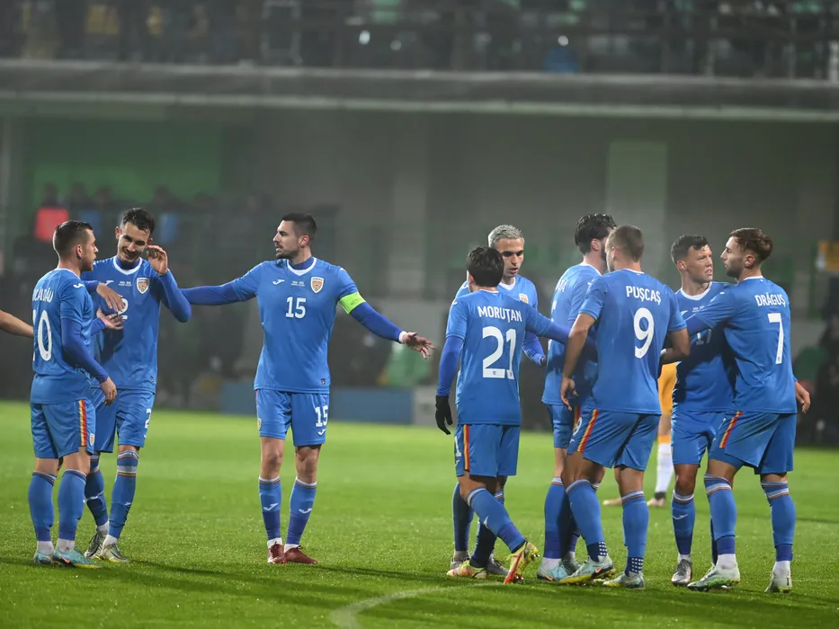 Bucurie a fotbalistilor romani dupa un gol marcat cu Alexandru Cicâldău, Raul Opruț, Andrei Burcă, Cristian Manea, Adrian Rus si Denis Drăguș in meciul amical de fotbal dintre Moldova si Romania, desfasurat pe Stadionul Zimbru din Chisinau, duminica 20 noiembrie 2022. © FOTO:Razvan Pasarica/SPORT PICTURES