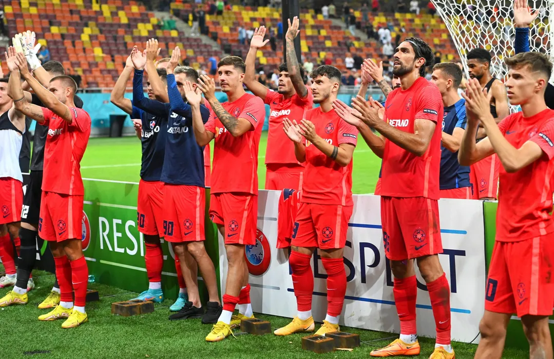 Fotbalistii stelisti David Raul Miculescu, Ianis Ilie Stoica, Florinel Teodor Coman, Andrea Compagno si Octavian George Popescu saluta galeria dupa meciul de fotbal dintre FCSB si RSC Anderlecht Bruxelles, din cadrul grupelor UEFA Europa Conference League, desfasurat pe Arena Nationala din Bucuresti, joi 15 septembrie 2022. © FOTO:Razvan Pasarica/SPORT PICTURES