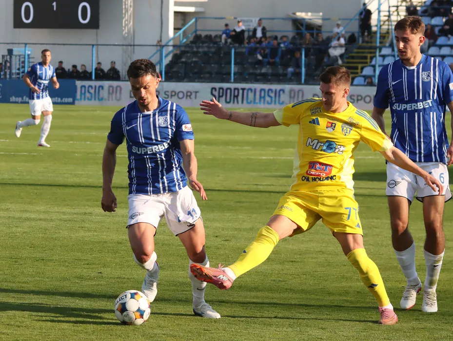 Cristian George Ganea si Denis Yanakov, Victor Robert Dican in meciul de fotbal dintre Farul Constanta si AFC Unirea 04 Slobozia, contand pentru Superliga Superbet Play-Out, desfasurat pe Stadionul Central al Academiei Gheorghe Hagi din Ovidiu, duminica 5 aprilie 2026. © FOTO:Sorin Danielciuc/SPORT PICTURES