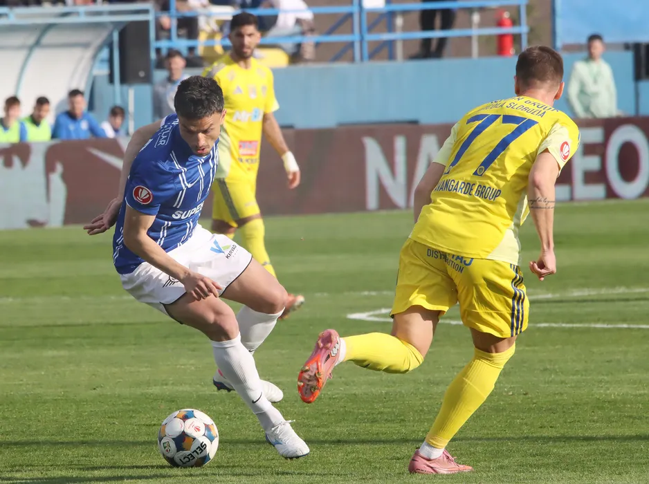 Cristian George Ganea si Denis Yanakov in meciul de fotbal dintre Farul Constanta si AFC Unirea 04 Slobozia, contand pentru Superliga Superbet Play-Out, desfasurat pe Stadionul Central al Academiei Gheorghe Hagi din Ovidiu, duminica 5 aprilie 2026. © FOTO:Sorin Danielciuc/SPORT PICTURES