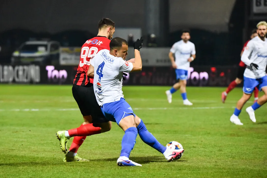 Gustavo Henrique Marins Silva si Cornel Nagy Zoard in meciul de fotbal dintre FK Csikszereda Miercurea Ciuc si FC Farul Constanta, contand pentru Superliga Superbet, desfasurat pe Stadionul Municipal din Miercurea Ciuc, vineri 6 martie 2026. © FOTO:Zoltan Pal/SPORT PICTURES