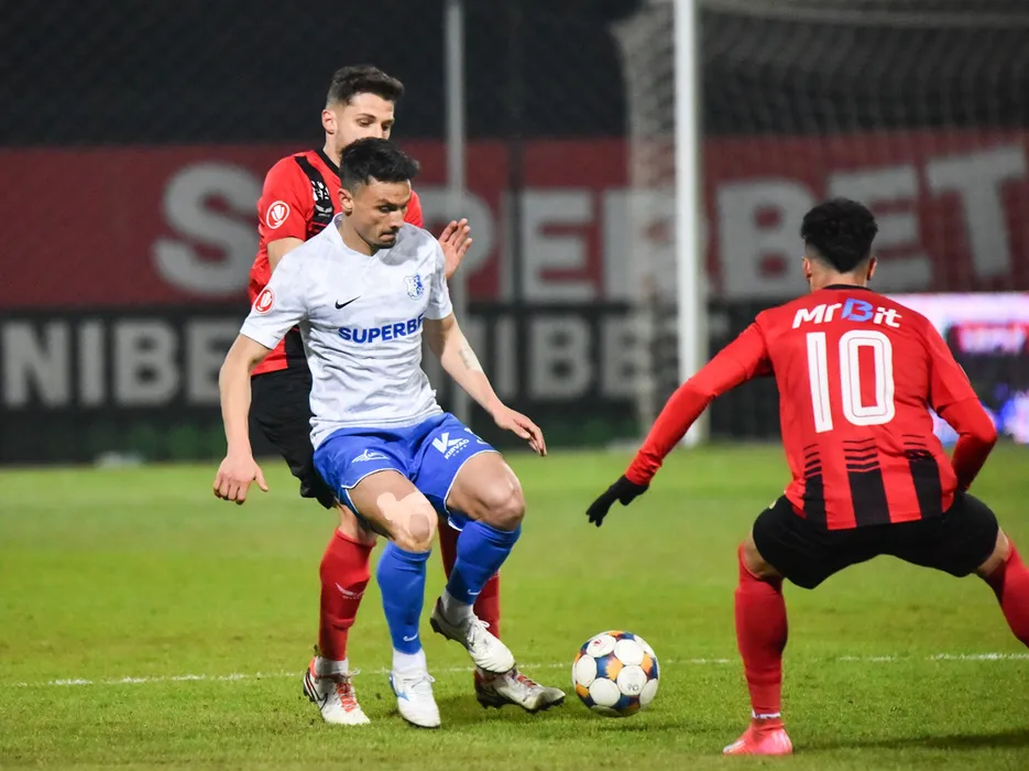 Cristian George Ganea si Szilárd Veres in meciul de fotbal dintre FK Csikszereda Miercurea Ciuc si FC Farul Constanta, contand pentru Superliga Superbet, desfasurat pe Stadionul Municipal din Miercurea Ciuc, vineri 6 martie 2026. © FOTO:Zoltan Pal/SPORT PICTURES