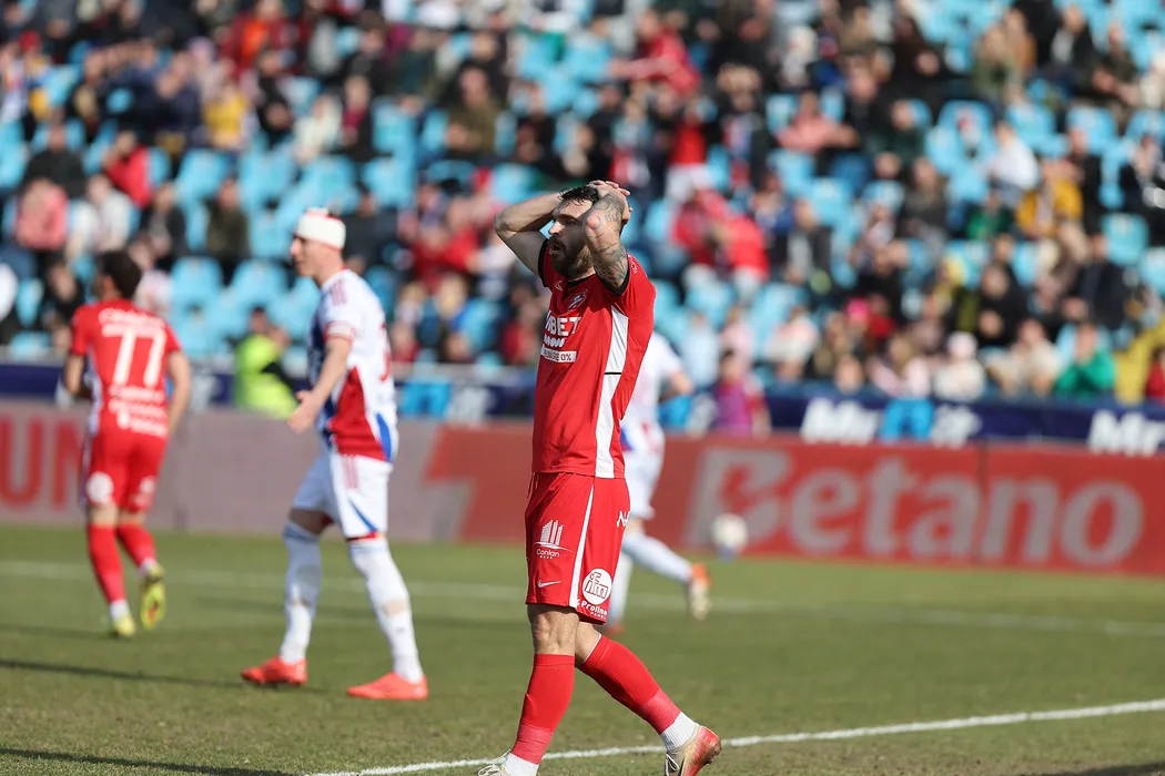 Aurelian Ionut Chitu dezamagit dupa o ratare in meciul de fotbal dintre SC Otelul Galati si AFC Hermannstadt, contand pentru Superliga Superbet, desfasurat pe Stadionul Otelul din Galati, duminica 8 martie 2026. © FOTO:Sorin Pana/SPORT PICTURES