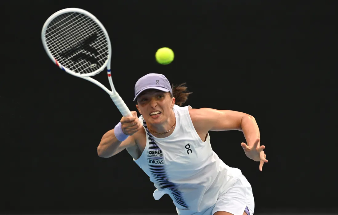 19 January 2026, Australia, Melbourne: Iga Swiatek of Poland in action during the Women's 1st round match against Yue Yuan of China on day 2 of the 2026 Australian Open tennis tournament at Melbourne Park in Melbourne. Photo: Lukas Coch/AAP/dpa