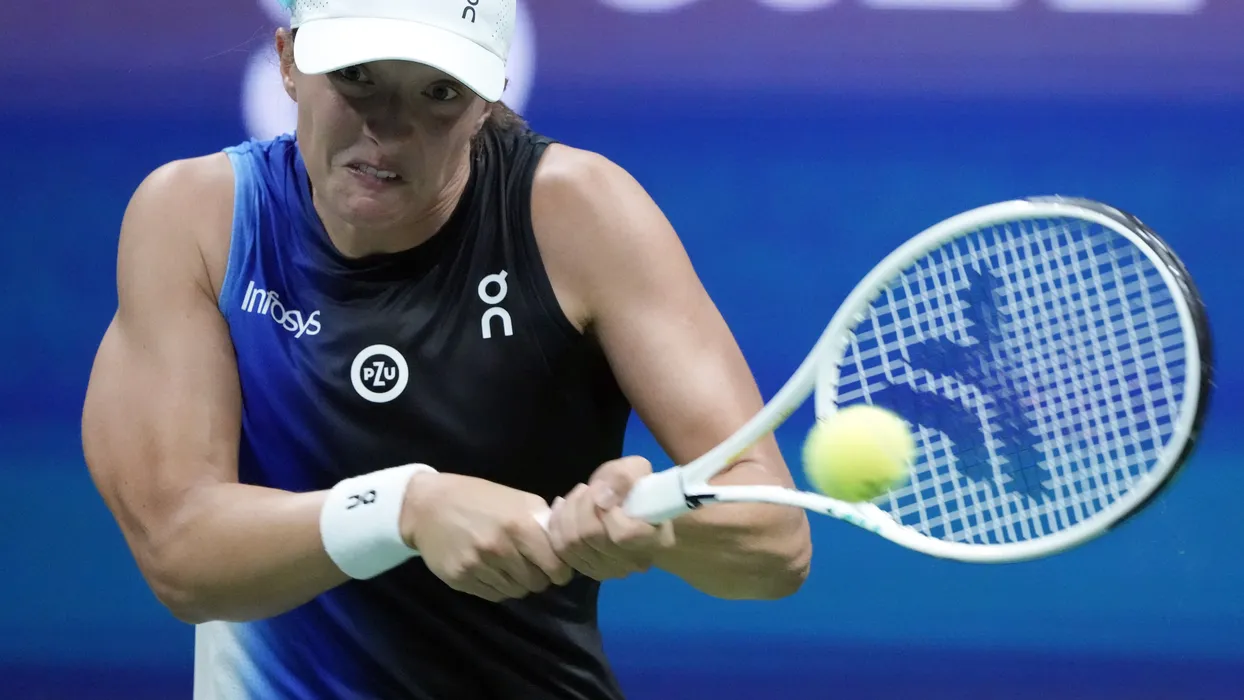 Iga Swiatek, of Poland, returns to Jelena Ostapenko, of Latvia, during the fourth round of the U.S. Open tennis championships, Sunday, Sept. 3, 2023, in New York. (AP Photo/John Minchillo)