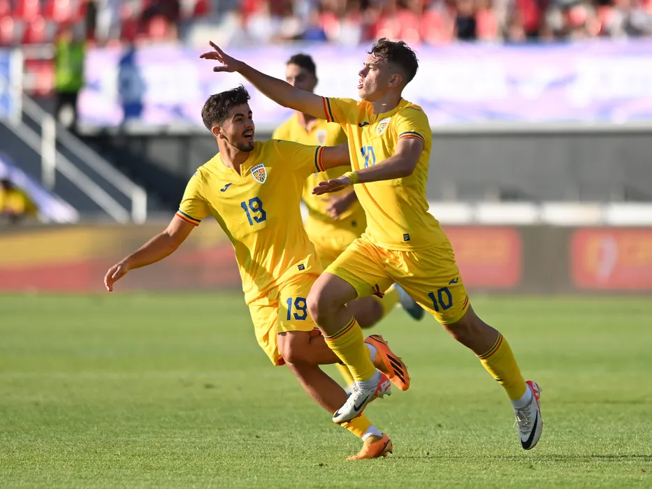 Eduard Radaslavescu se bucura dupa un gol marcat alaturi de Tony Strata in meciul amical de fotbal dintre Romania U20 si Cehia U20, desfasurat pe Stadionul Eugen Popescu din Targoviste, joi 7 septembrie 2023. © FOTO:Razvan Pasarica/SPORT PICTURES
