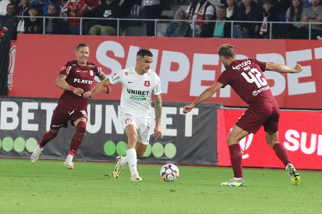Goncalves Tiago Lisboa Silva și Ciprian Ioan Deac în meciul de fotbal dintre AFC Hermannstadt Sibiu si FC CFR 1907 Cluj, petru Superliga Superbet, desfășurat pe Stadionul Municipal din Sibiu, sâmbătă 21 septembrie 2024. © FOTO: Valentin MACREA/SPORT PICTURES