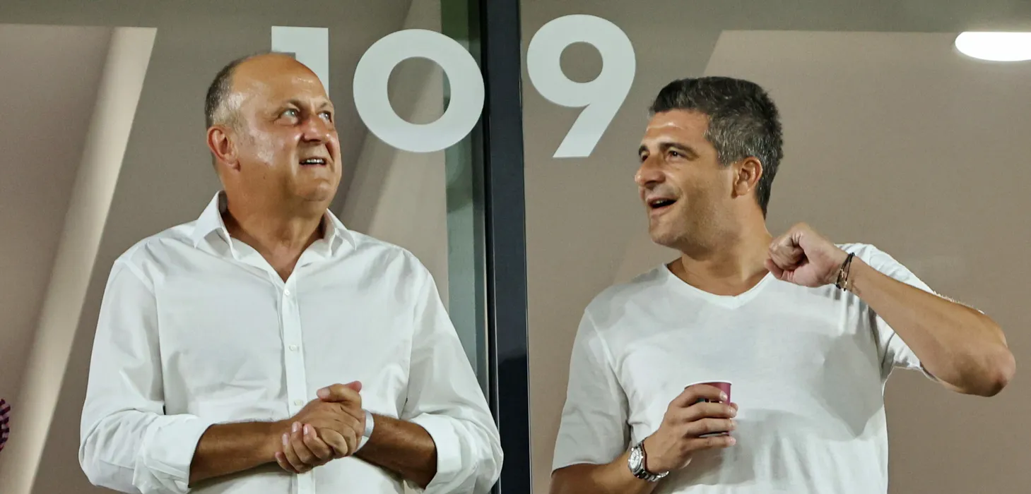 Actionarul clubului Rapid, Dan Sucu, si Daniel Niculae, presedintele Rapidului, urmaresc meciul de fotbal dintre echipele Rapid si FCSB din etapa a II-a a Superligii, disputat pe stadionul Rapid- Giulesti din Bucuresti, duminica, 24 iulie 2022 GEORGE FILIP / MEDIAFAX FOTO