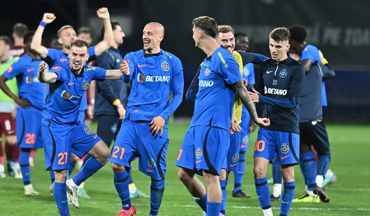 Fotbalistii stelisti Darius Dumitru Olaru, Vlad Iulian Chiricheș, Andrei Ionuț Pandele si Octavian George Popescu se bucura dupa meciul de fotbal dintre CFR Cluj si FCSB, contând pentru Play off-ul Superligii Superbet, desfășurat pe Stadionul Dr. Constantin Raduescu din Cluj Napoca, duminica 14 aprilie 2024.,Image: 864918011, License: Rights-managed, Restrictions: , Model Release: no