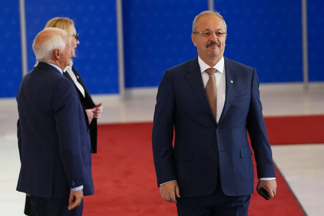 Romania's Defense Minister Vasile Dincu, right, arrives for a meeting of EU Defense Ministers at the Prague Congress Center in Prague, Czech Republic, Tuesday, Aug. 30, 2022. (AP Photo/Petr David Josek)