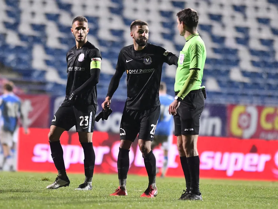 Virgil Eugen Ghita si Alin Dobrosavlevici in discutii cu arbitrul central in meciul de fotbal dintre CSM Politehnica Iasi si FC Viitorul Constanta, contand pentru Liga 1 Casa Pariurilor, desfasurat fara spectatori pe Stadionul Emil Alexandrescu din Iasi, duminica 1 noiembrie 2020. © FOTO:Razvan Pasarica/SPORT PICTURES