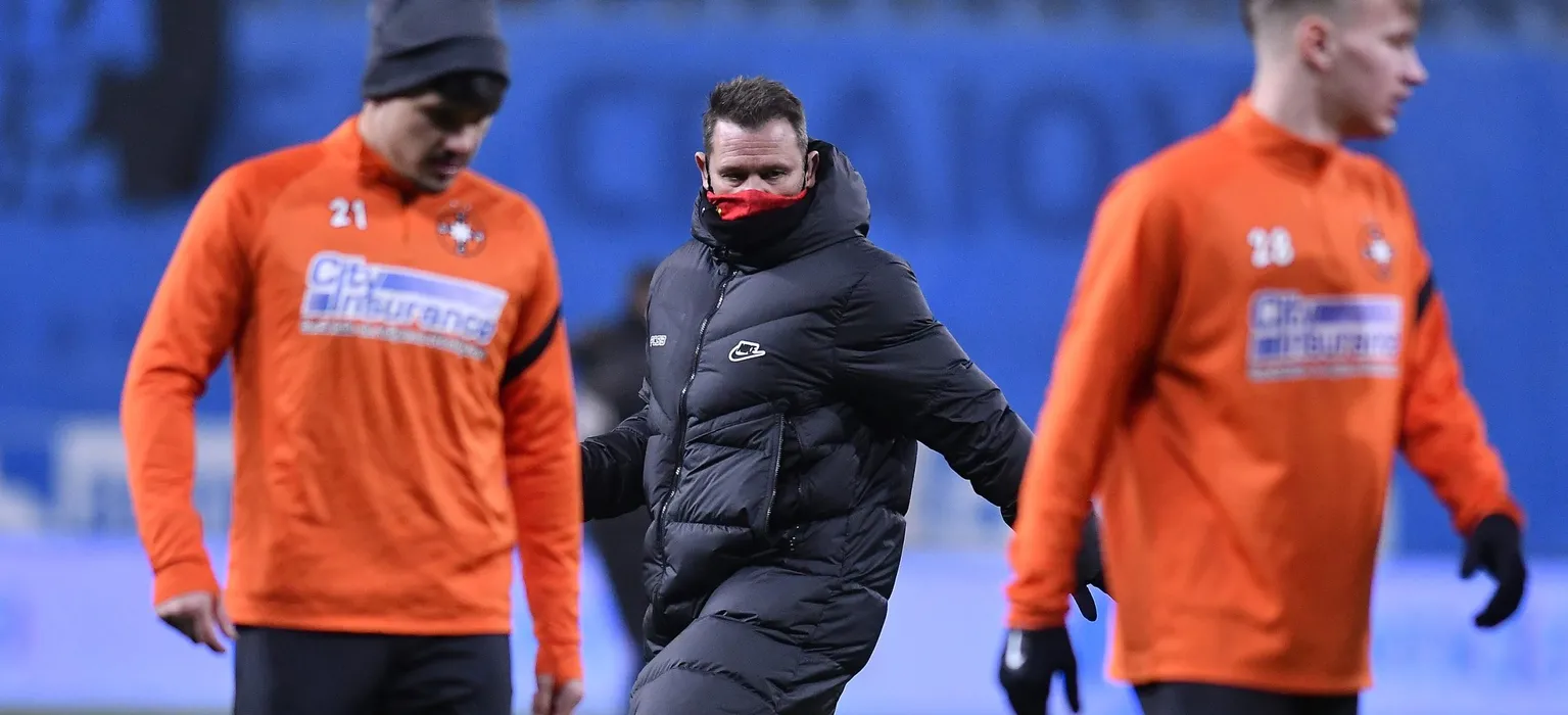 Preparatorul fizic Thomas Neubert lucreaza alaturi de fotbalistii stelisti in pauza meciului de fotbal dintre Universitatea Craiova si FCSB, contand pentru Liga 1 Casa Pariurilor, desfasurat fara spectatori pe Stadionul Ion Oblemenco din Craiova, vineri 18 decembrie 2020. © FOTO:Razvan Pasarica/SPORT PICTURES