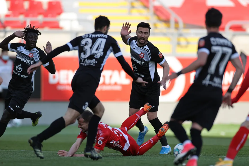 Baba Alhassan, Razvan Adrian Dalbea si Evgenii Shliakov in meciul de fotbal dintre UTA Arad si FC Hermannstadt, contand pentru Liga 1 Casa Pariurilor, desfasurat fara spectatori pe Stadionul Francisc Neuman din Arad, vineri 23 aprilie 2021. © FOTO:Sebastian Tataru/SPORT PICTURES