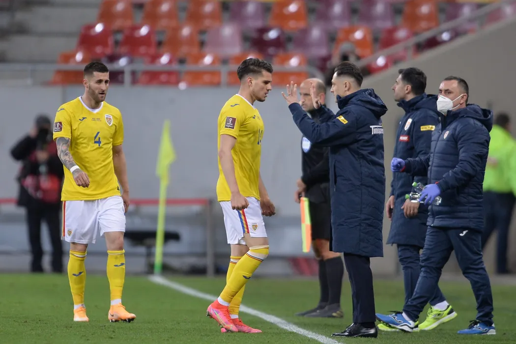 Reprezentativele Romaniei (echipament galben) si Macedoniei de Nord s-au intalnit intr-o partida contand pentru preliminariile CM 2022, joi 25 noiembrie 2021, pe Arena Nationala din Bucuresti. ALEXANDRU DOBRE / MEDIAFAX FOTO