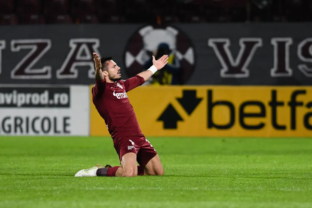 Andrei Burca, de la CFR Cluj, reactioneaza dupa ce a inscris un gol in timpul meciului de fotbal contra echipei CS Universitatea Craiova din etapa a IX - a a Ligii 1, disputat pe stadionul Dr. Constantin Radulescu, luni, 20 septembrie 2021. FLAVIU BUBOI / MEDIAFAX FOTO