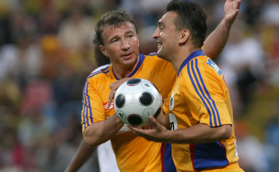 Dan Petrescu (S) si Ilie Dumitrescu (D), de la echipa Stelele Romaniei, se bucura in timpul meciului cu Stelele Lumii, disputat in cadrul evenimentului caritabil Seara Campionilor, pe stadionului din Bulevardul Ghencea, in Bucuresti, 26 mai 2008. Meciul caritabil opune o selectionata all-time a Romaniei, incepand cu Mircea Lucescu, Lita Dumitru, Generatia de aur a anilor '90 si pana la actuala echipa nationala, unei selectionate internationale a prietenilor lui Figo. CONSTANTIN VLADESCU / MEDIAFAX FOTO