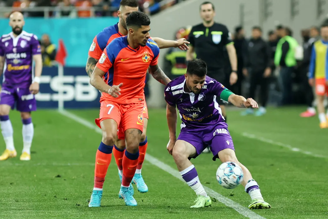 Florinel Coman (S), de la FCSB, lupta pentru balon cu Ionut Serban (D), de la FC Arges, in meciul de fotbal din etapa a 7- a a play-off-ului Ligii 1, disputat pe Arena Nationala din Bucuresti, luni, 2 mai 2022. GEORGE FILIP / MEDIAFAX FOTO