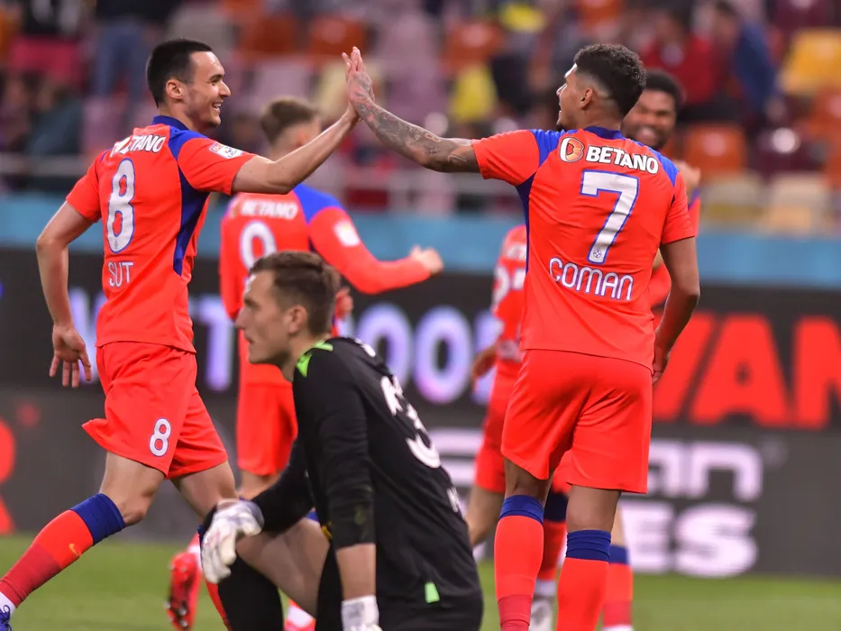 Bucurie a fotbalistilor stelisti dupa un gol marcat cu Adrian Gheorghe Sut si Florinel Teodor Coman in meciul de fotbal dintre FCSB si FC Arges, contand pentru Play-off-ul Ligii 1 Casa Pariurilor, desfasurat pe Arena Nationala din Bucuresti, luni 2 mai 2022. © FOTO:Razvan Pasarica/SPORT PICTURES